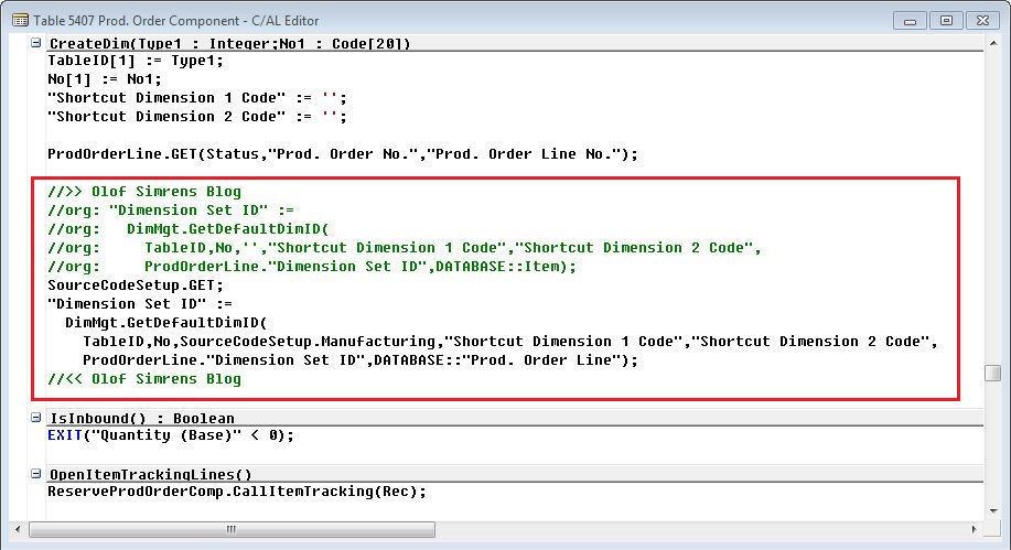 Now we have done the setup, what is left is to go and change the code that retrieves the dimension set id for the production order components. The code to change is in table 5407 – Prod. Order Component and the function called CreateDim. As you can see I have deactivated the some original code and entered a couple of lines very similar but with the source code from the source code setup table and with the table to inherit from being the prod. order line.