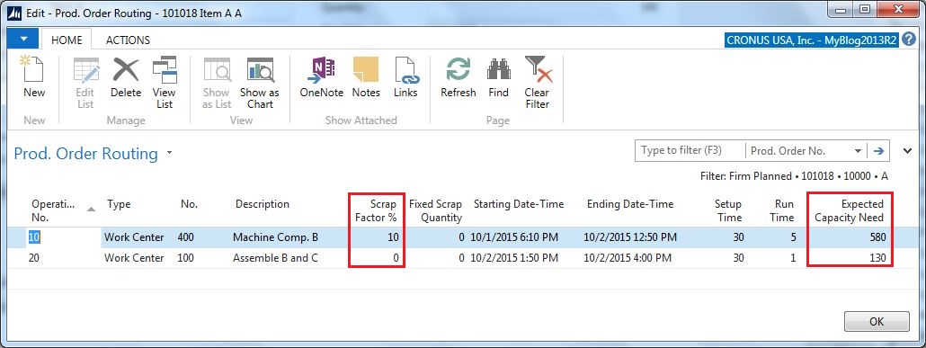 When the production order is created the value of the Scrap Factor % field from the routing line is transferred to the Scrap Factor % field of the production order routing and the capacity need for the operation is increased accordingly.